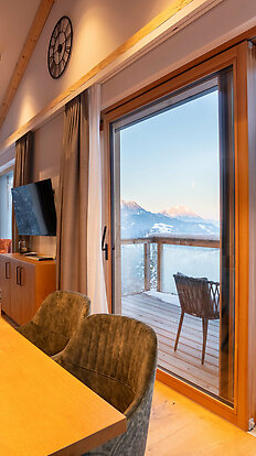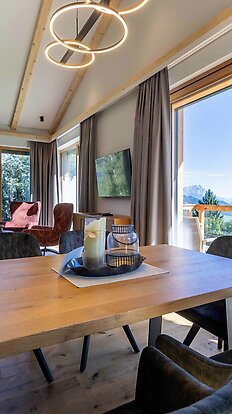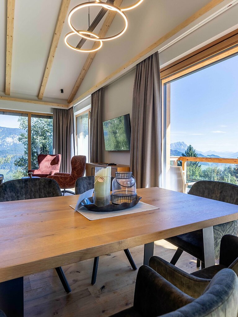 Mit ihren 80 m² Fläche schafft die einladende Lodge eine Atmosphäre aus moderner Natürlichkeit, die Gäste sofort begeistert. Schon beim Betreten wird das Gefühl von Privatsphäre und Gemütlichkeit spürbar. Der direkte Blick vom Balkon offenbart eine großartige Aussicht auf die weitläufige Natur und das beeindruckende Bergmassiv des Ennstals - vom Grimming bis zum Dachstein ist das gesamte Panorama für Sie sichtbar.
