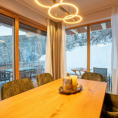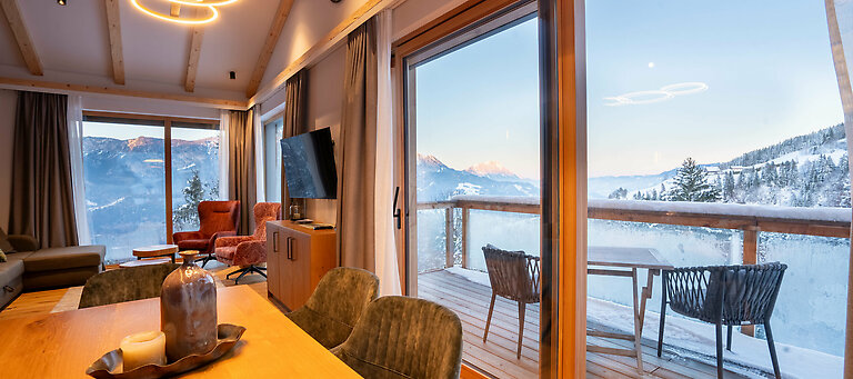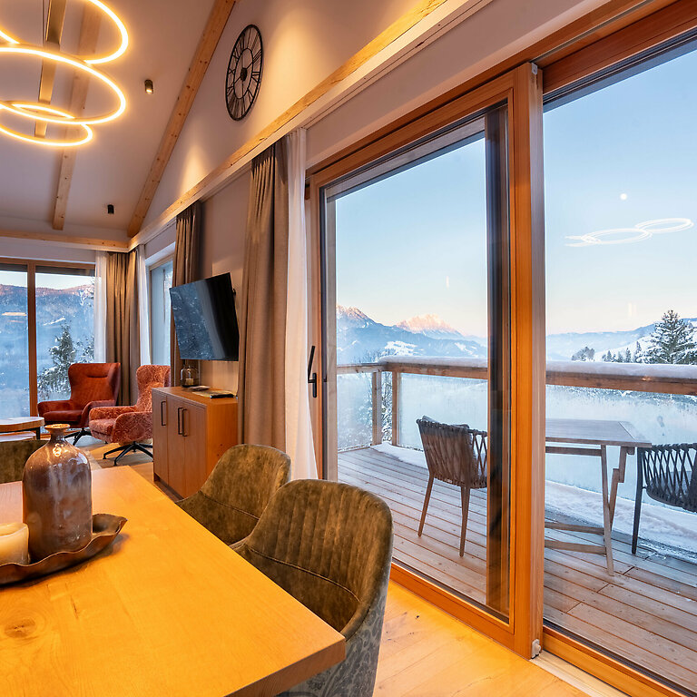 With its 80m² of space, the inviting lodge creates an atmosphere of modern naturalness that immediately inspires guests. The feeling of privacy and cosiness is palpable as soon as you enter. The direct view from the balcony reveals a magnificent view of the expansive nature and the impressive mountain massif of the Enns Valley - from the Grimming to the Dachstein, the entire panorama is visible to you.